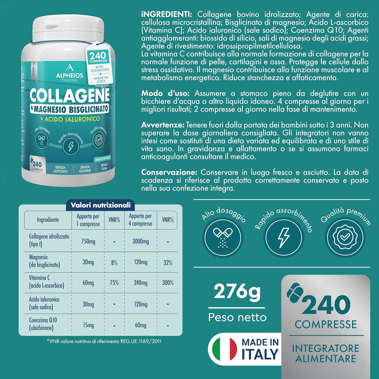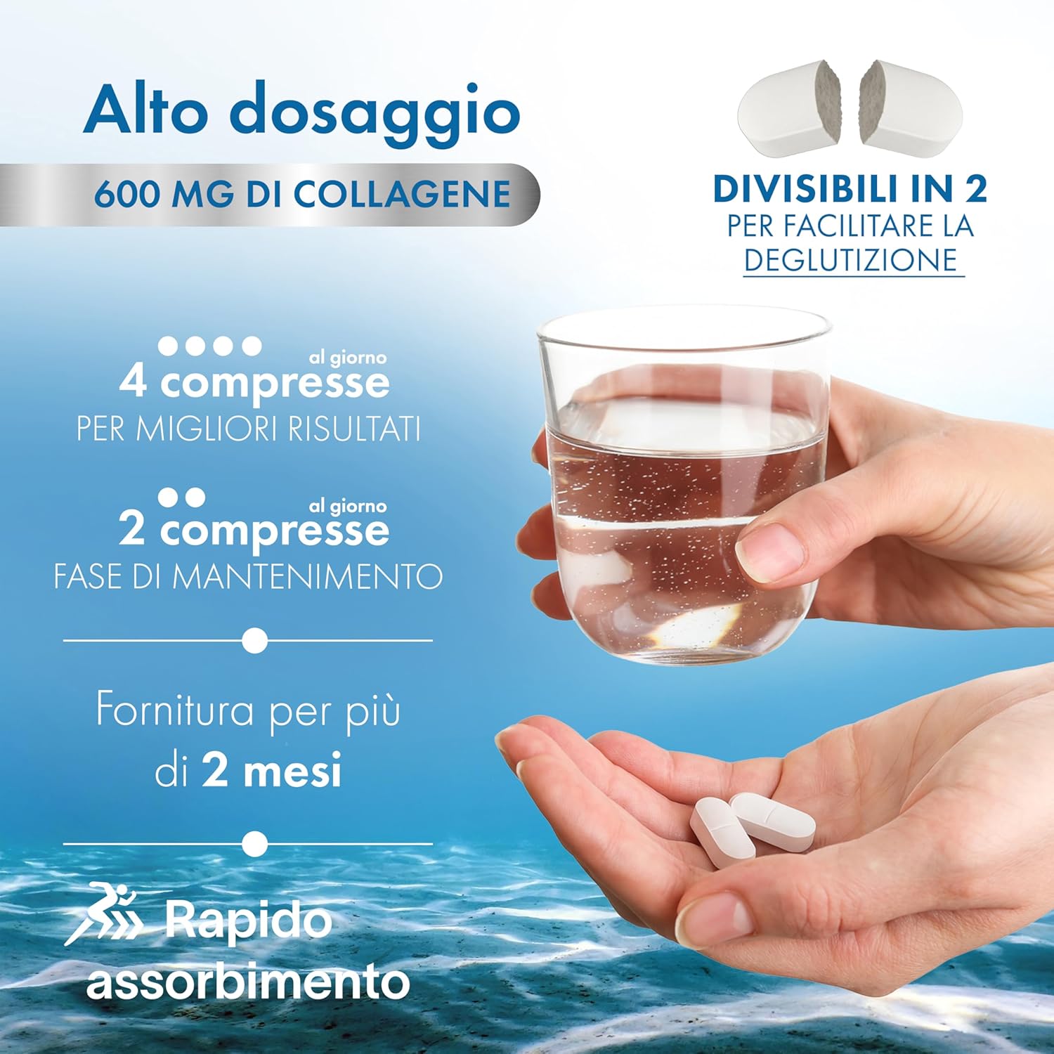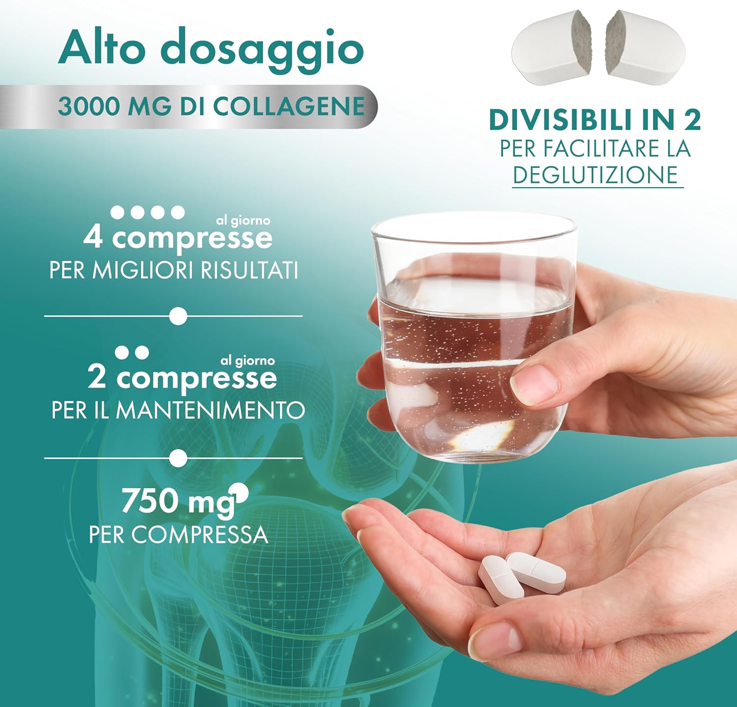 [COLLAGENE IDROLIZZATO AD ALTO DOSAGGIO 3000 mg] – Formula concentrata con 750 mg di collagene per compressa, ideale per sostenere elasticità cutanea, forza di tendini e ossa e migliorare la mobilità articolare. L’assorbimento rapido favorisce una maggiore biodisponibilità rispetto alle comuni formulazioni in polvere.
