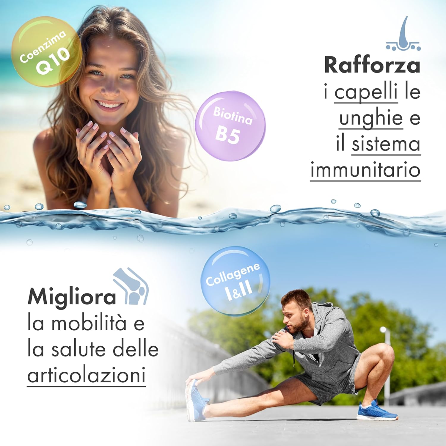 [SOSTEGNO PER ARTICOLAZIONI, PELLE E CAPELLI] – La combinazione di Collagene marino di Tipo I e II supporta flessibilità e resistenza delle articolazioni, riduce dolori e rigidità articolare, migliorando il benessere generale. Ideale per chi pratica sport o desidera un supporto extra per la mobilità.